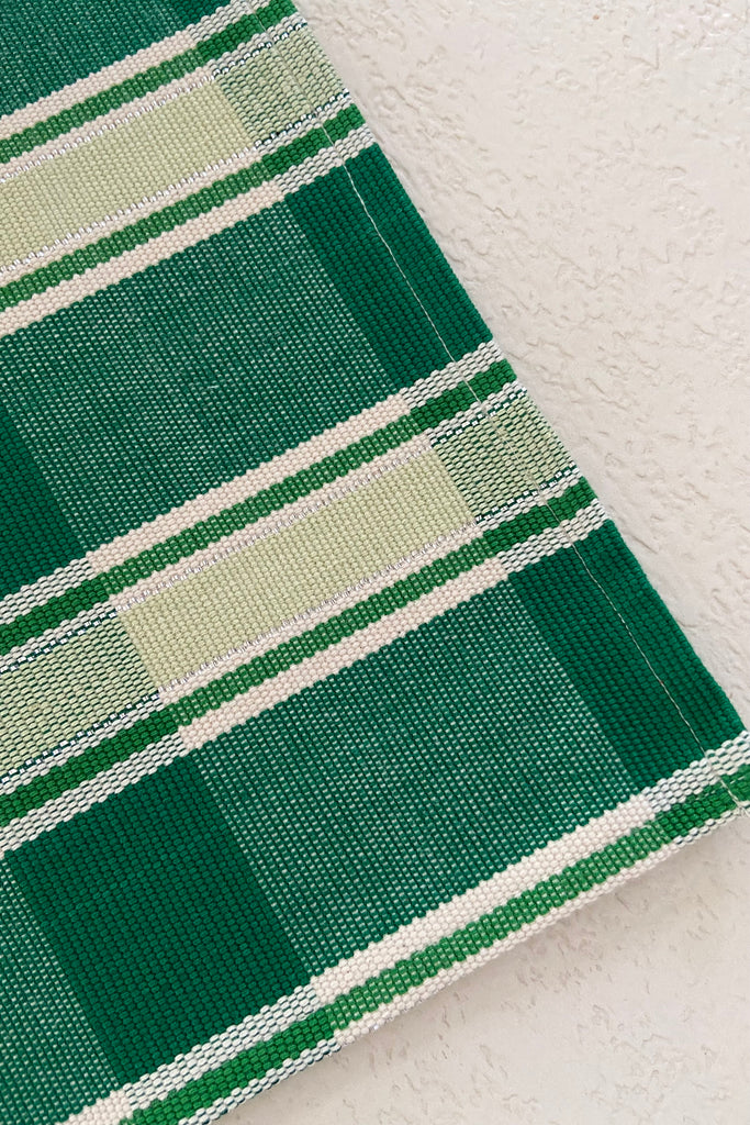 Our Jacinta striped table runner is vibrant addition to any dining or kitchen styling. Stripes of grass green, light pistachio, white and metallic silver are woven into bold and graphic stripes, creating the perfect seasonal or year round textile.