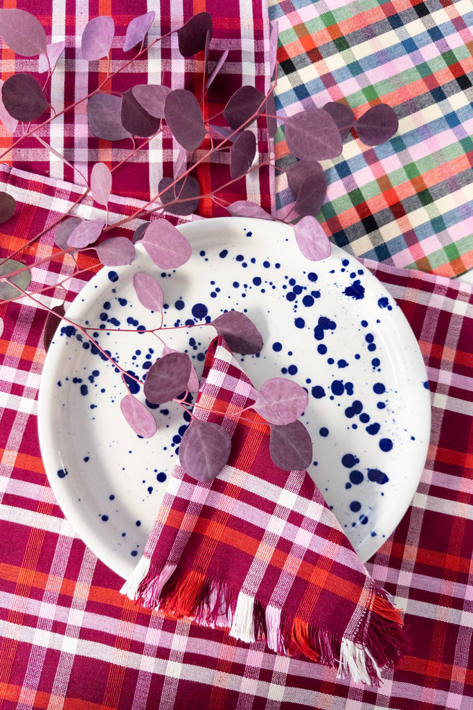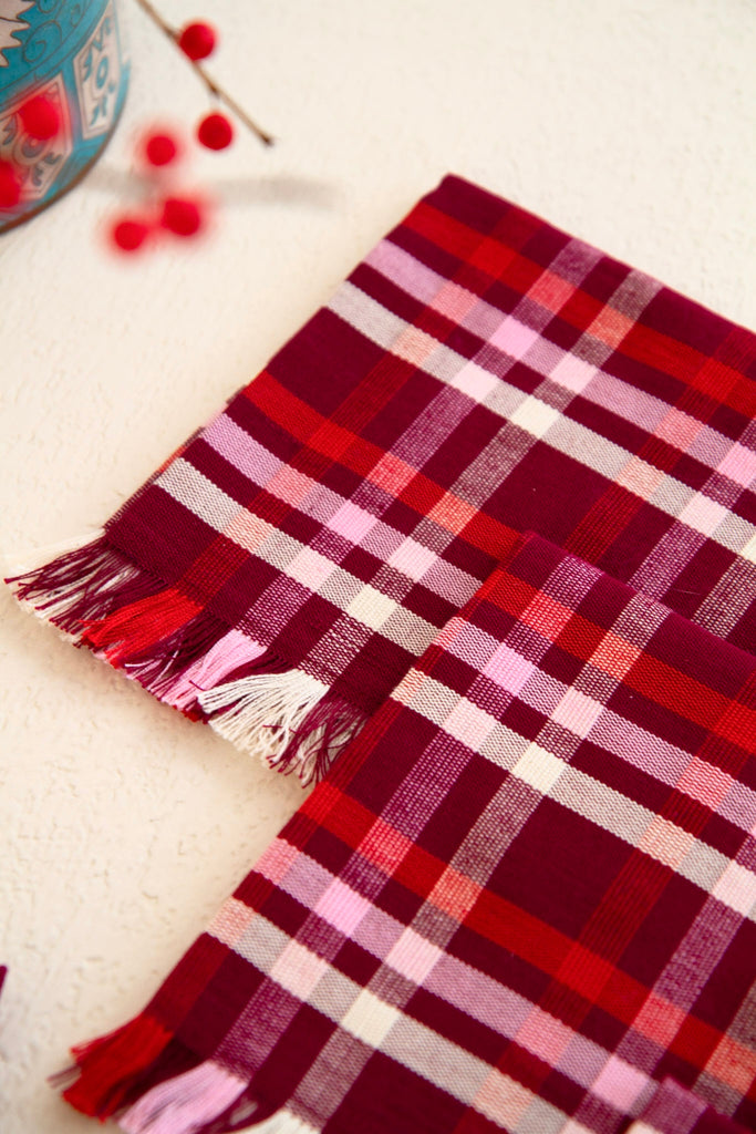 Our Valeria party napkins are a warm and cheery addition to any dining or kitchen styling. Stripes of burgundy, cranberry, light pink and white are woven into a plaid pattern to create a colorful seasonal or year round textile.
