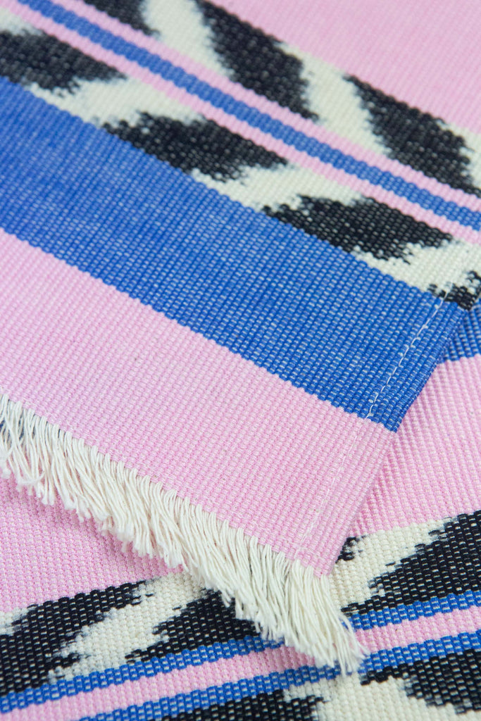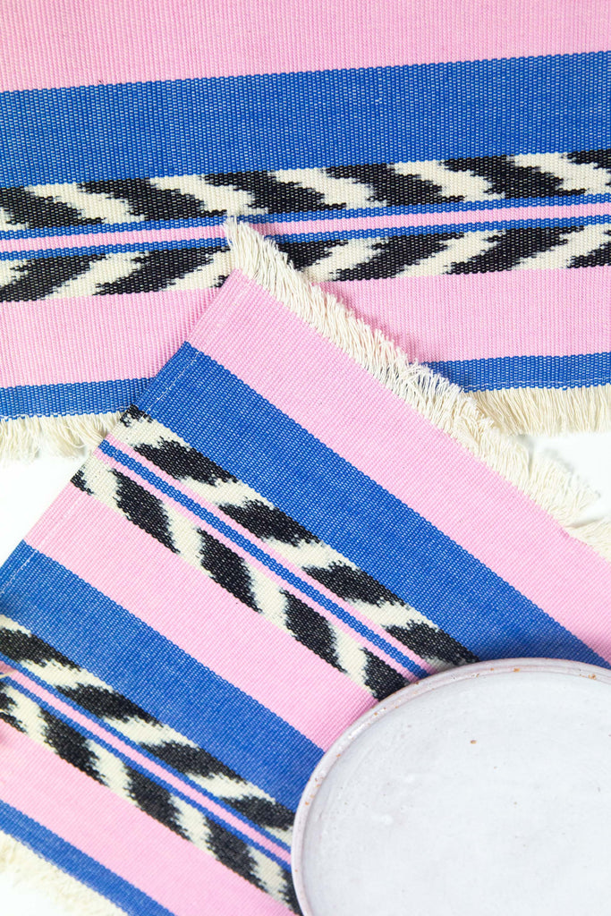 The Palm placemat is the perfect accent to add vibrant color and texture to any table setting. Pink and blue striped placemats featuring hand-dyed ikat (jaspe) on natural white cotton. Ethically handwoven by artisans in Totonicapan, Guatemala on traditional footlooms.