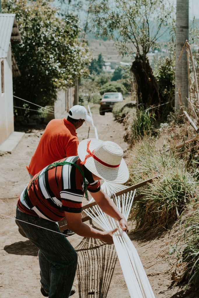 The Palm table runner is the perfect accent to add vibrant color and texture to any table setting. Pink and blue striped placemats featuring hand-dyed ikat (jaspe) on natural white cotton. Ethically handwoven by artisans in Totonicapan, Guatemala on traditional footlooms.