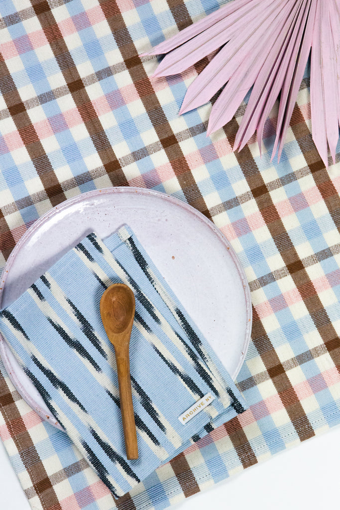 The Louisa runner is the perfect plaid accent to add color and texture to any table setting. Stripes of light pink, baby blue and umber are woven together to create this textile. Ethically handwoven by artisans in Xela, Guatemala.