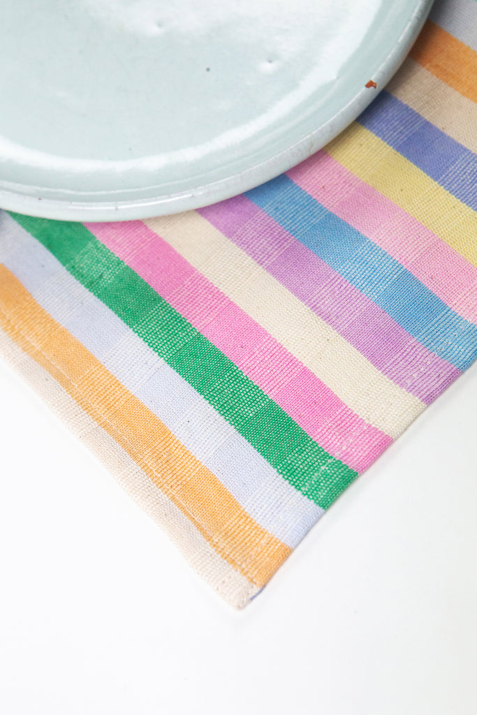 The Maxine pastel rainbow striped runner is the perfect colorful accent to add color and texture to any table setting.  Stripes of light pink, kelly green, periwinkle, peach, cream, hyacinth, light yellow, sky blue and lilac are woven together to create this brilliantly colorful piece. Ethically handwoven by artisans in Xela, Guatemala.