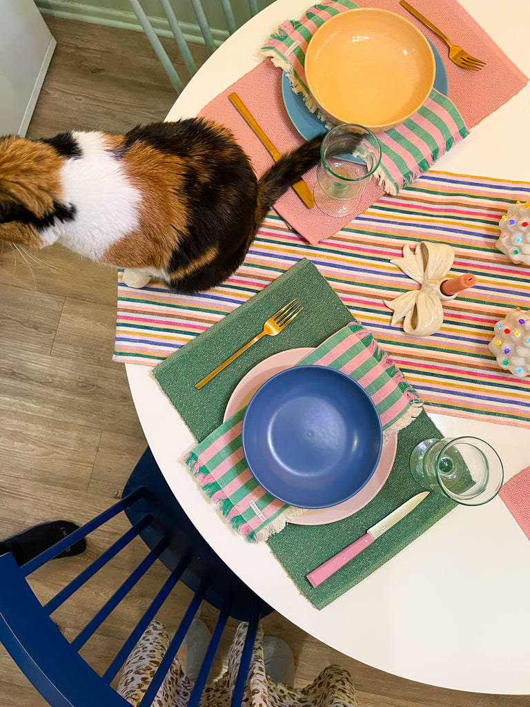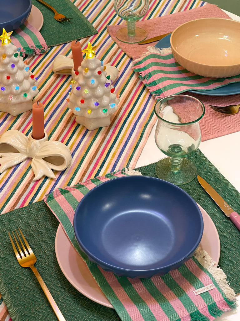 The Valentina multicolor striped runner is the perfect rainbow accent to add color and texture to any table setting. Stripes of light pink, ochre, emerald, lilac, royal blue, umber and fuchsia are woven together to create this brilliantly colorful piece. Ethically handwoven by artisans in Xela, Guatemala.