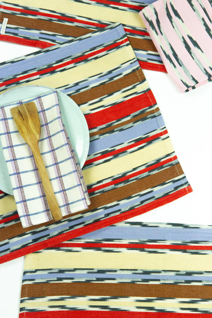 These placemats were woven in Guatemala by artisans on traditional footlooms, these napkins feature an intricate Guatemalan tie dye technique jaspe that creates the stunning grey and white pattern running through this textile. Hand crafted and ethically made.