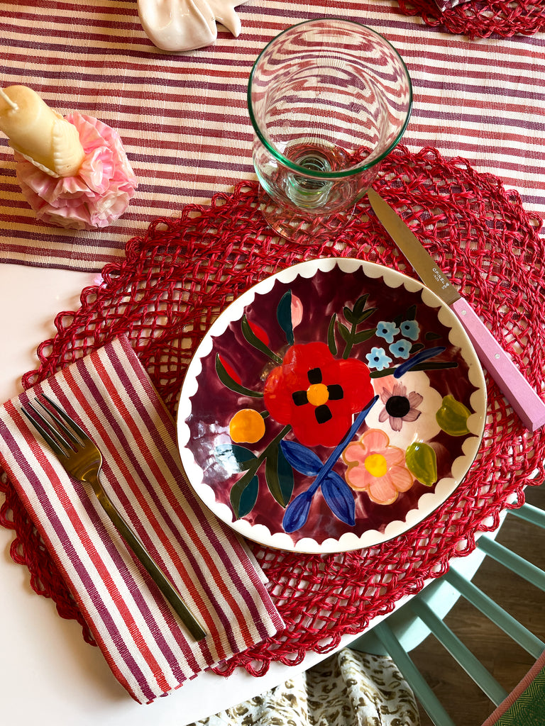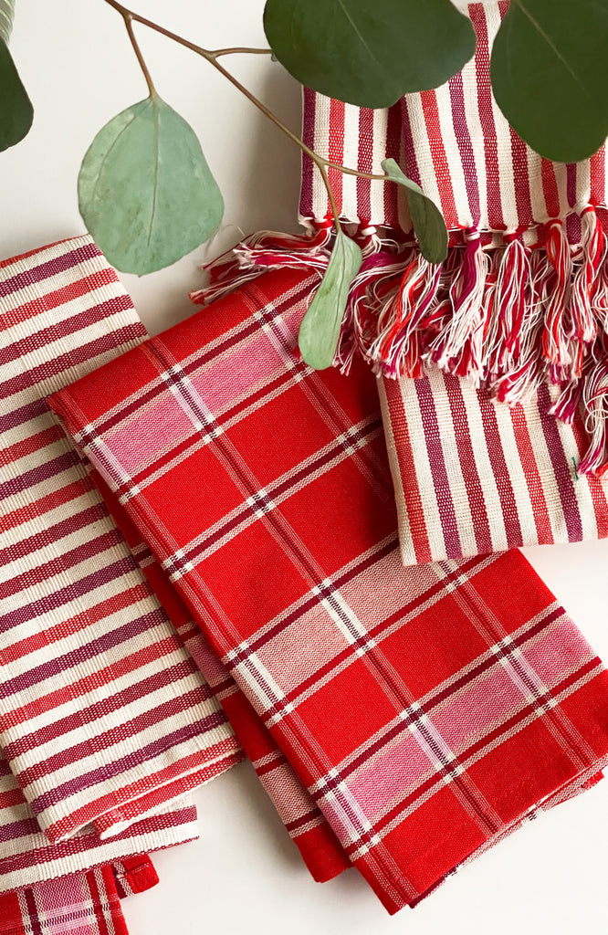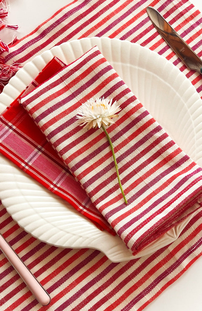 Our Elina striped dinner napkins are a perfect addition to your dining or kitchen styling. Woven stripes of red, cranberry, raspberry and natural ivory, make this piece a classic and versatile textile.