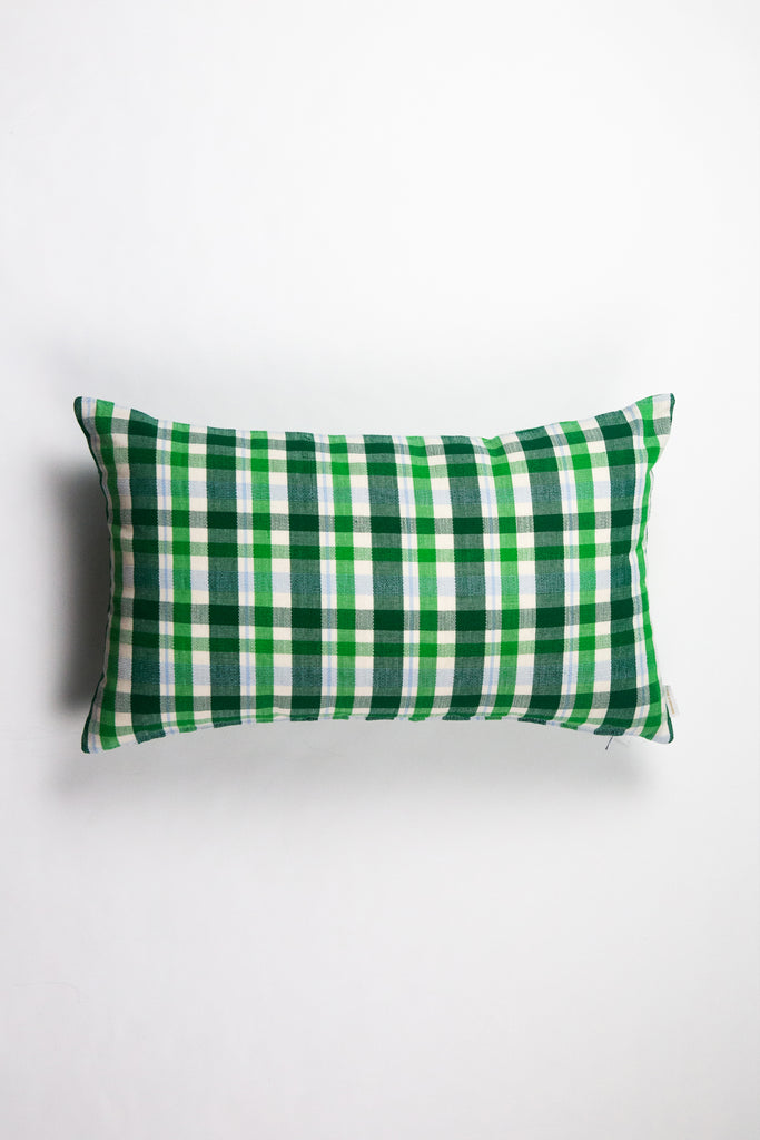 Our Josefina ruffle plaid pillow is the perfect accent to add soft color and texture to any sofa, bedroom or accent chair. Stripes of evergreen, grass green and blue accent are woven together to create this bold piece. Ethically handwoven by artisans in Xela, Guatemala.