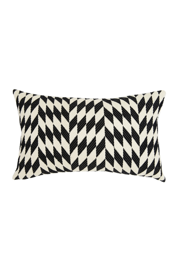 This textile represents graphic black and white colorstory of a traditional textile from Almolonga, Guatemala. It was woven by artisans using a back-strap loom, a time honored method of weaving. This pillow was made in partnership with a non-profit organization on Lake Atitlan, Guatemala.