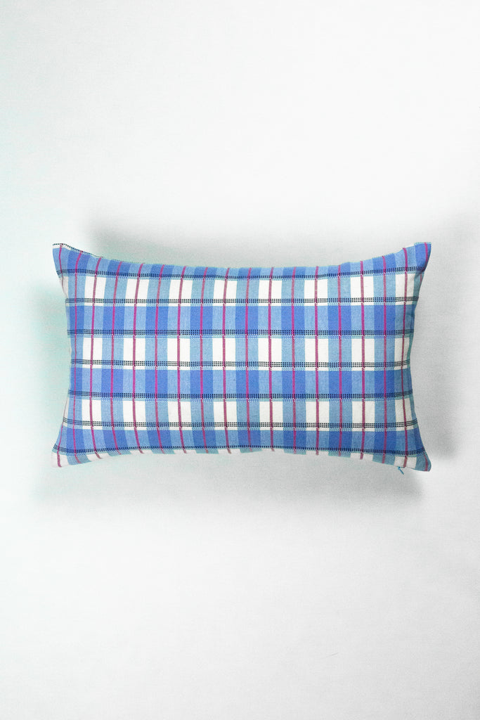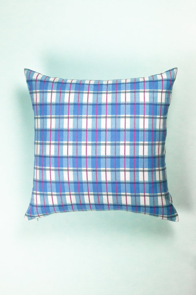 Blue & white plaid pillow, ethically handwoven by artisans in Chiapas, Mexico on traditional footlooms. With hints of hot pink and navy, this updated classic plaid will be a lively addition to any decor.