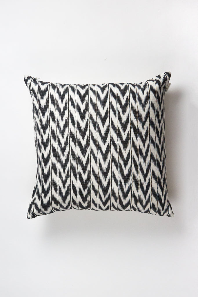 This textile was woven by an artisan from the Totonicapan, Guatemala, using a footloom. This pillow features an intricate Guatemalan tie dye technique jaspé. This particular jaspé design is specific to Totonicapan.