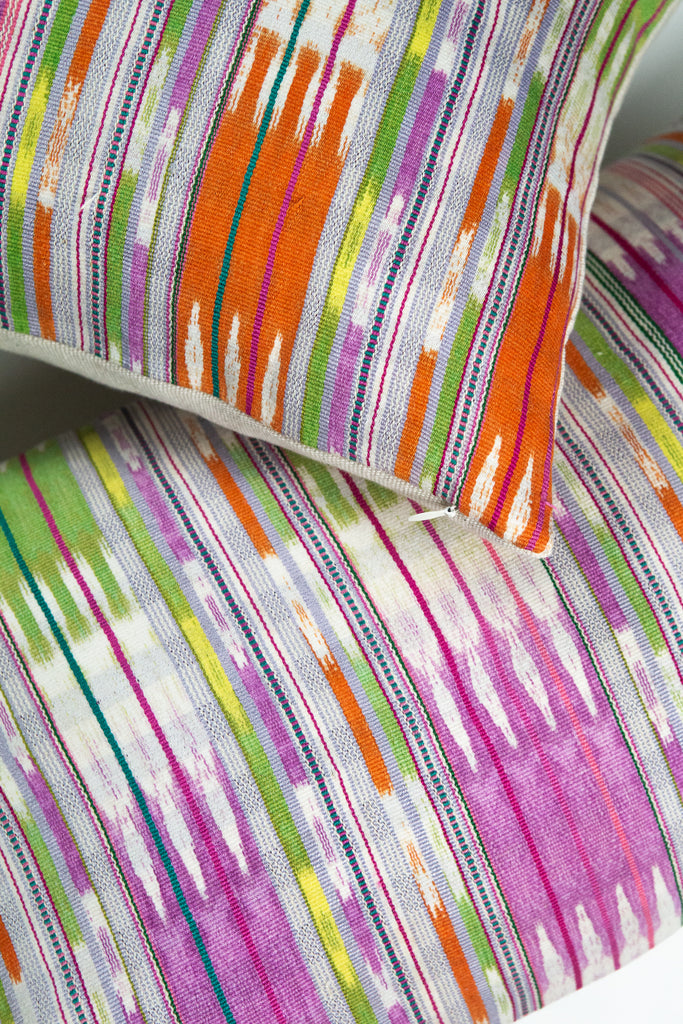 This vintage Guatemalan textile was originally a traditional skirt fabric. It is made from ikat dyed fabric with multi-colored stripes, then handwoven on a footloom.