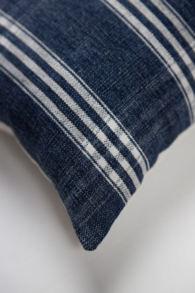 This dark indigo denim striped pillow is the perfect accent to any decor style. Made from traditional Guatemalan skirt fabric, each pillow is handwoven on traditional footlooms by indigenous Maya artisans. Whether clean and minimal, or layered and traditional, this versatile pillow has lots of styling potential.