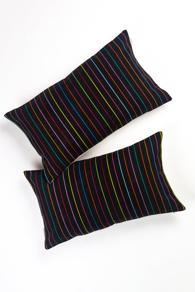 This striking washed black denim pillow with rainbow striped lines is the perfect graphic accent to any decor style. Whether clean and minimal, or layered and bold, this versatile pillow has lots of styling potential.