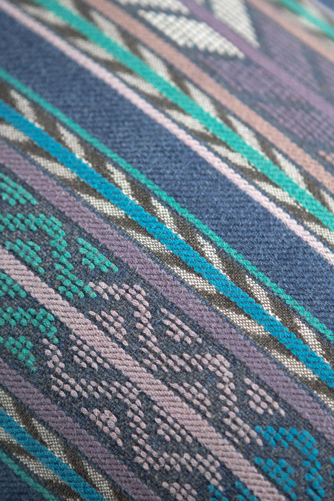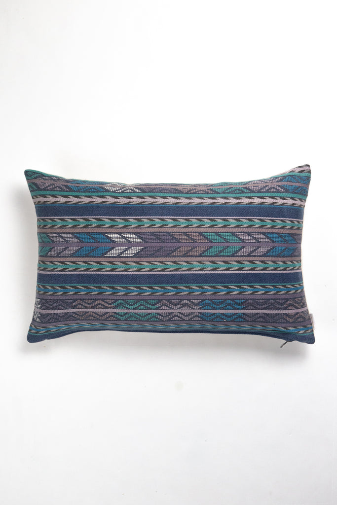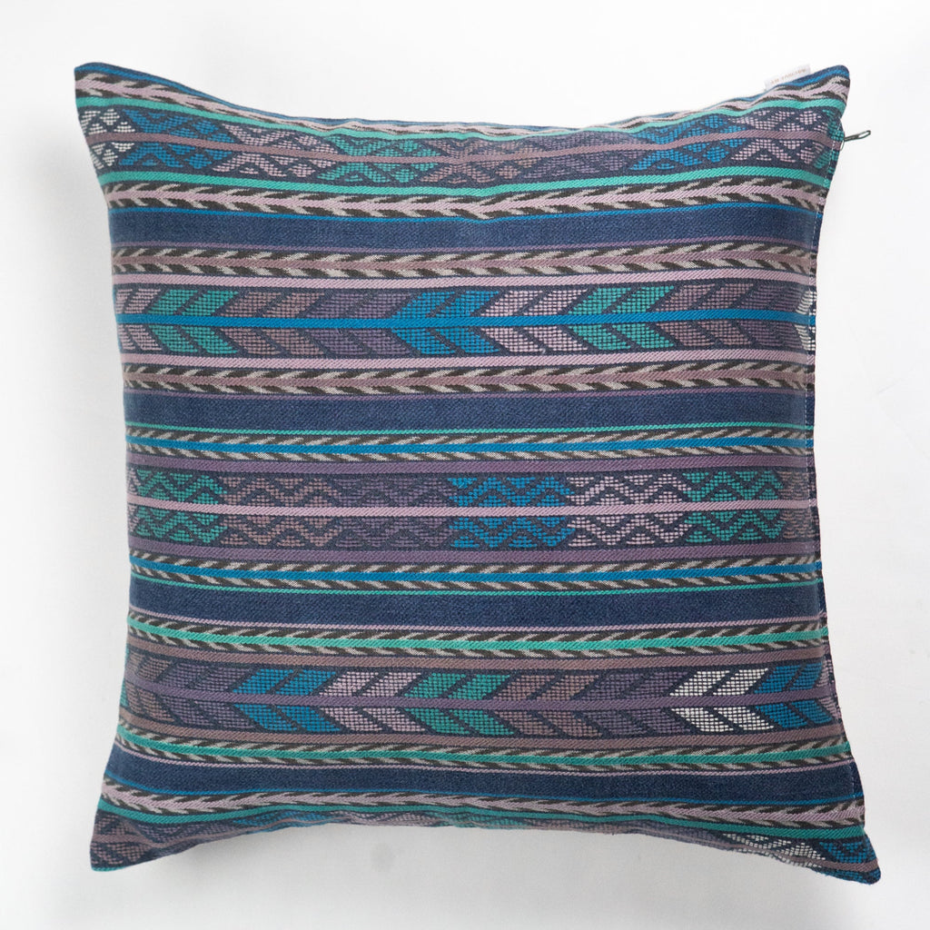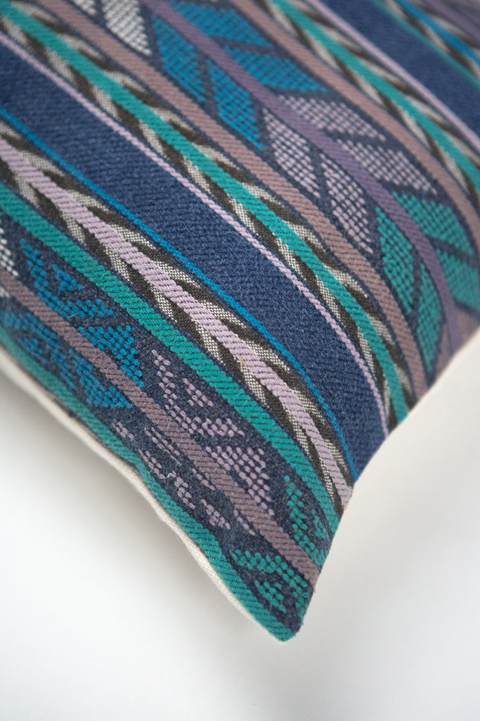 This washed denim with brocade pattern pillow is the perfect accent to any decor style. Made from traditional Guatemalan skirt fabric, each pillow is handwoven on traditional footlooms by indigenous Maya artisans. With chevron stripes of soft green, pink, purple, black, white and blue, this pillow is a unique and beautiful textile to add any sofa or accent chair.