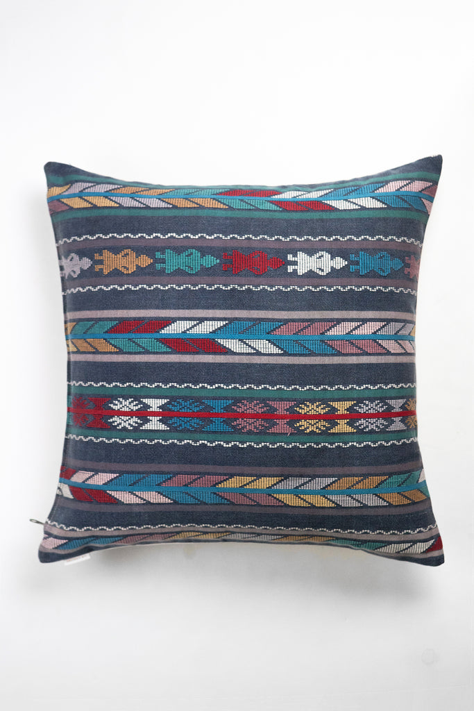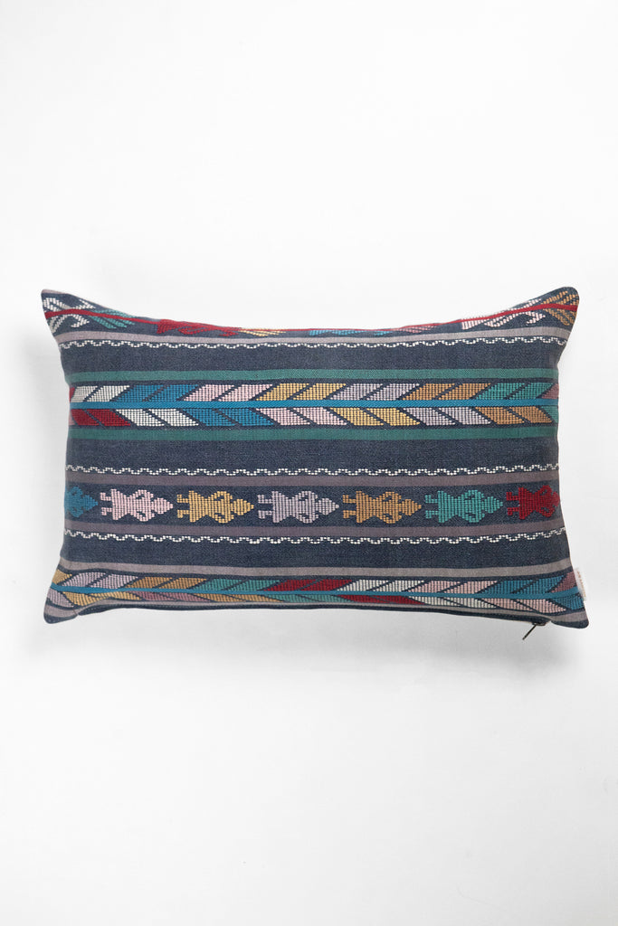 This dark grey denim with brocade pattern pillow is the perfect accent to any decor style. Made from traditional Guatemalan skirt fabric, each pillow is handwoven on traditional footlooms by indigenous Maya artisans. With chevron stripes of red, yellow, pink, soft green, white and blue, this pillow is a unique and beautiful textile to add any sofa or accent chair.