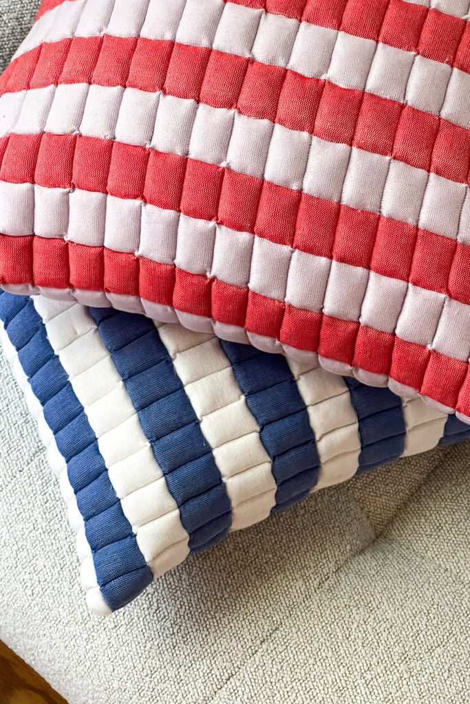 These gorgeous handwoven double-weave quilted pillows are hand made in Gujarat India. Now only three families in India make this specialized weaving style that dates back to the 1860s.