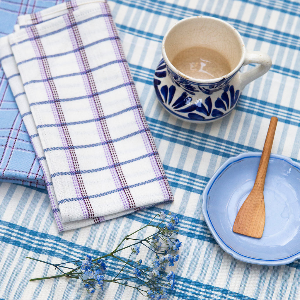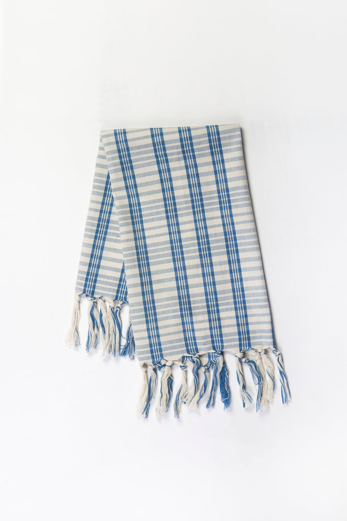Natural Indigo and ivory cotton kitchen towel, ethically handwoven by artisans in Totonicapan, Guatemala on traditional footlooms. Hand dyed using natural indigo dyes on super soft natural white (ivory colored) cotton.